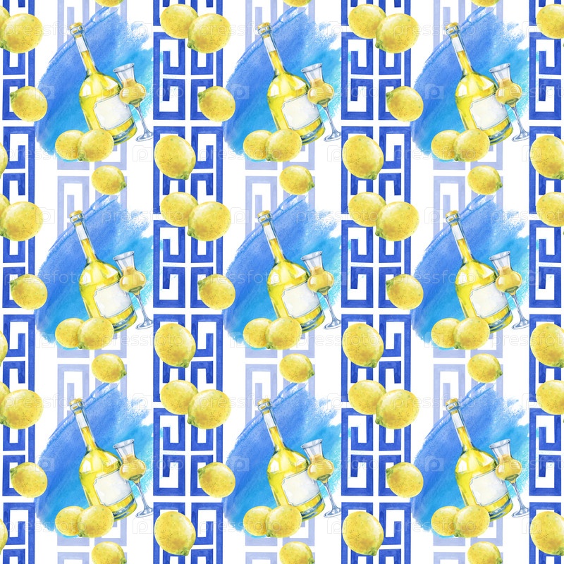 Акварельный бесшовный рисунок с бутылкой, бокалом лимонного национального напитка Греции и фруктами на фоне синего геометрического орнамента. Шаблон для ткани, обоев, подарочной упаковки, текстиля, меню и скрапбукинга