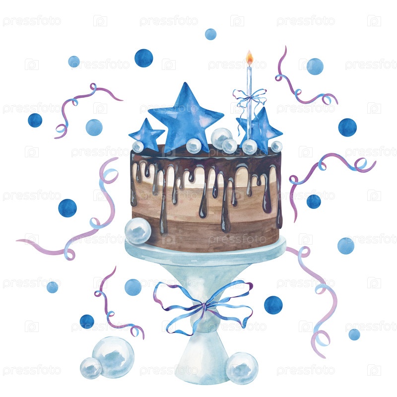 Акварельный шоколадный торт на стенде с голубым декором для празднования дня рождения мальчика, нарисованный вручную. иллюстрация десерта со свечами, лентами, звездами, конфетти и стримерами