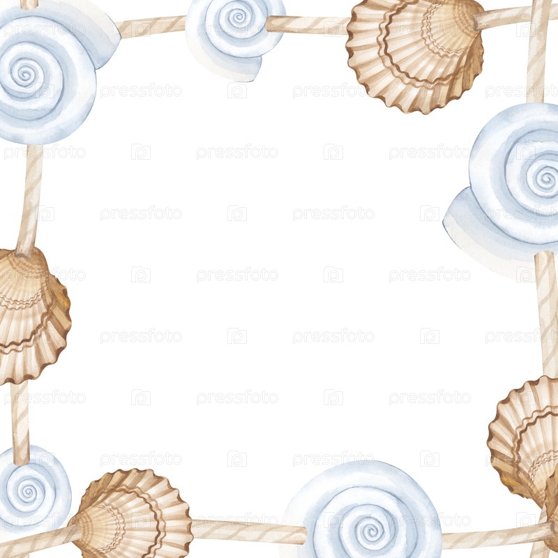 Квадратная рама с рисованными вручную подвесками. Илюстрация акварели выделена на белом фоне. Декор различных ракушек и жютиной струны. Тема моря. Пустое пространство для введения