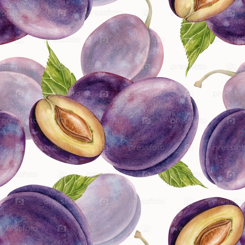 Бесшовный акварельный рисунок с целыми и половинами сливовых плодов и зелеными листьями. Ботаническая иллюстрация зрелых фруктов на белом фоне. Ботанический шаблон для упаковки бумаги, скарапбука, упаковки и обоев