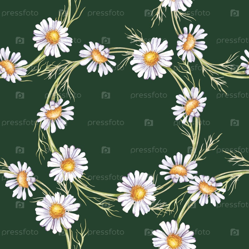 Бесшовный рисунок с ромашковыми венками на темно-зеленом фоне. Иллюстрация акварели. Бесшовный фон с белыми дикими цветами, собранными в круглый венок. Ботанический летний шаблон для обоев, скрапбуков и упаковки
