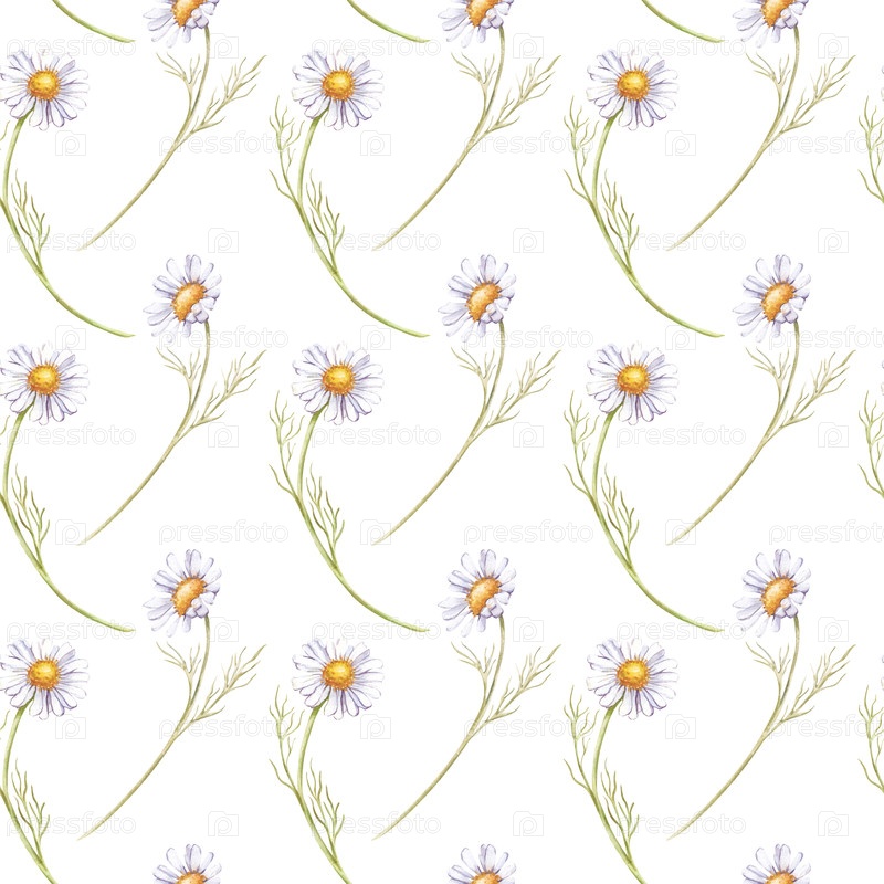 Акварель бесшовный рисунок с ромашками на белом фоне. Ботаническая иллюстрация диких цветов. Цветочный узор для обоев, ткани, упаковки