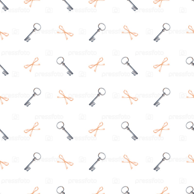 Бесшовный рисунок с ключами и оранжевыми луками на белом фоне. бесшовный фон с элементами акварели, нарисованными вручную. иллюстрация акварели. романтический шаблон для упаковки, обои