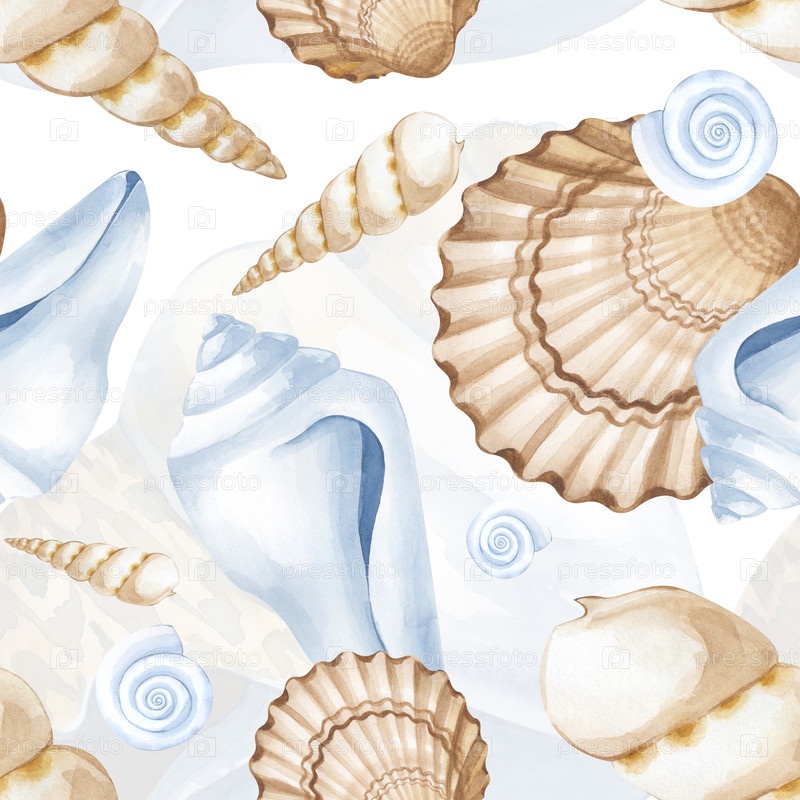 Нежный бесшовный рисунок с различными раковинами в синем, белом и коричневом цветах. акварельный фон с моллюсками. иллюстрация для украшения праздников на морской тематике, обои, упаковка