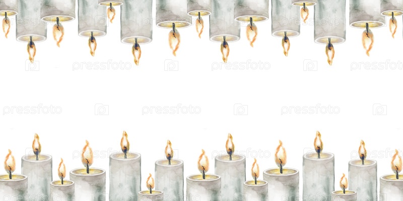 Горизонтальная рама с горящими свечами на белом фоне. Иллюстрация акварели с серыми свечами. Пустое место для вставки. Подходит для Хэллоуина или других праздников. мистицизм
