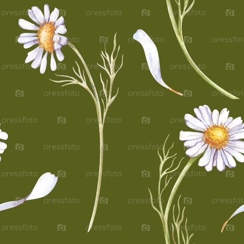 Бесшовный акварельный рисунок с ромашками и лепестками. Дикие белые цветы на зеленом фоне. Иллюстрация акварели. Дизайн для упаковки, текстиля, обоев