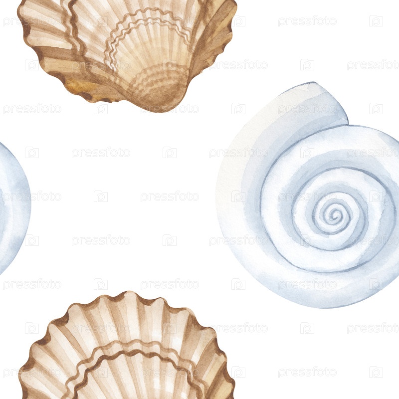 Вручную нарисован бесшовный акварельный рисунок с моллюсками. Иллюстрация на белом фоне. Художественный дизайн акварели для украшения праздников в морском стиле