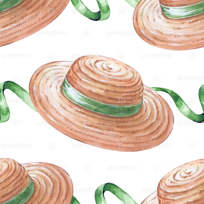 Бесшовный рисунок с женскими шляпами и зеленой лентой на белом фоне. Иллюстрация акварели. Для обоев, упаковки