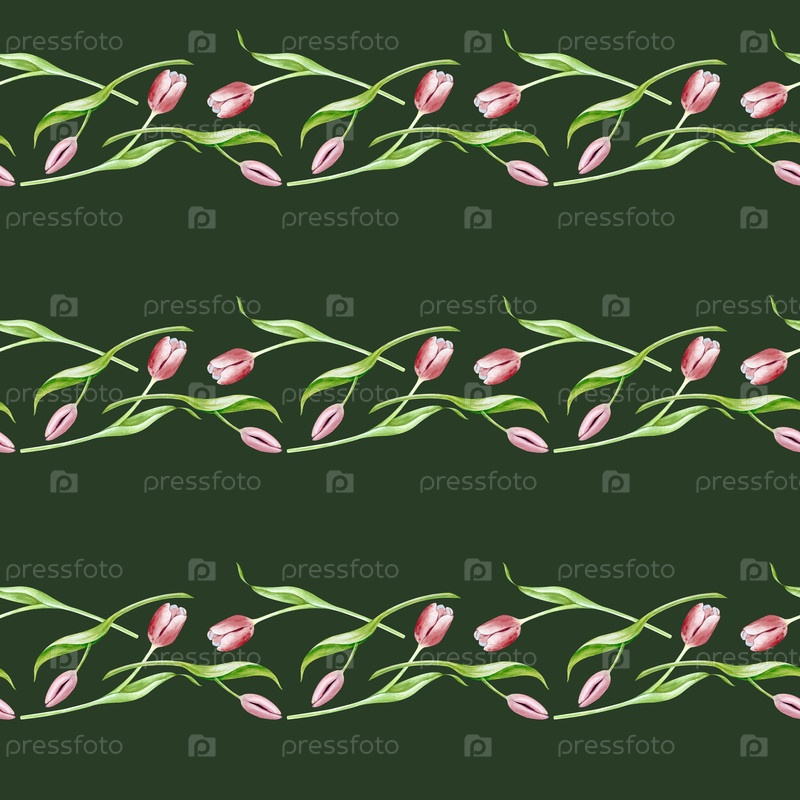 Бесшовный акварельный рисунок с розовыми тюльпанами на зеленом фоне. цветочный шаблон. ботаническая иллюстрация. романтическая весенняя тема для упаковки, обои