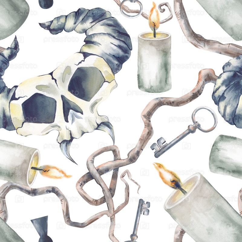 Акварель - это бесшовный рисунок для Хэллоуина на белом фоне. Бесшовный фон с черепами мистических существ, зубчатыми ветвями деревьев, зажженными свечами и ключами. сказочный шаблон