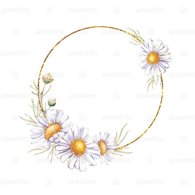 Золотая круглая рама с маргаритками. Ручно нарисованный шаблон цветущих растений для поздравительных открыток или свадебных приглашений. Водяной венок с дикими цветами и почками. Пустое место для представления