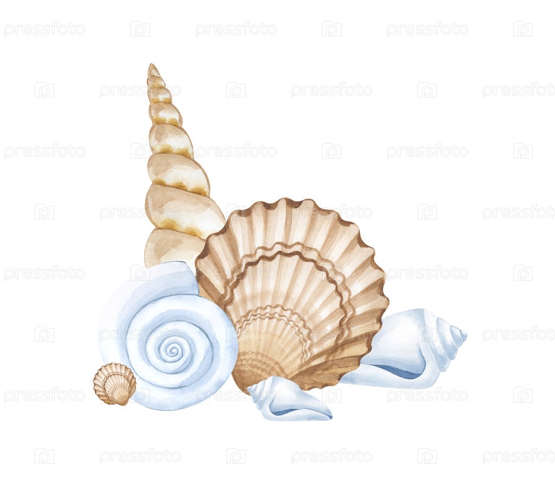 Акварельная иллюстрация моллюсков. Состав различных раскопок манускриптов на белом фоне. Изолированные. Шаблон для морского стиля дизайна