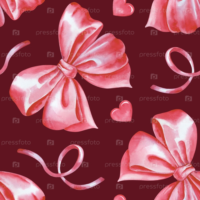 Акварельный бесшовный рисунок с розовыми луками, лентами и сердцами на темно-красном фоне