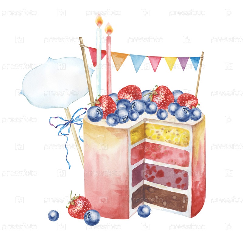 Праздничная композиция с разрезанным тортом, зажженными свечами, флагами, табличкой надписей и свежими ягодами. Иллюстрация акварели выделена на белом фоне. Яркий рисунок ягодного пирога для открыток, приглашений, поздравлений, юбилеев, свадьб