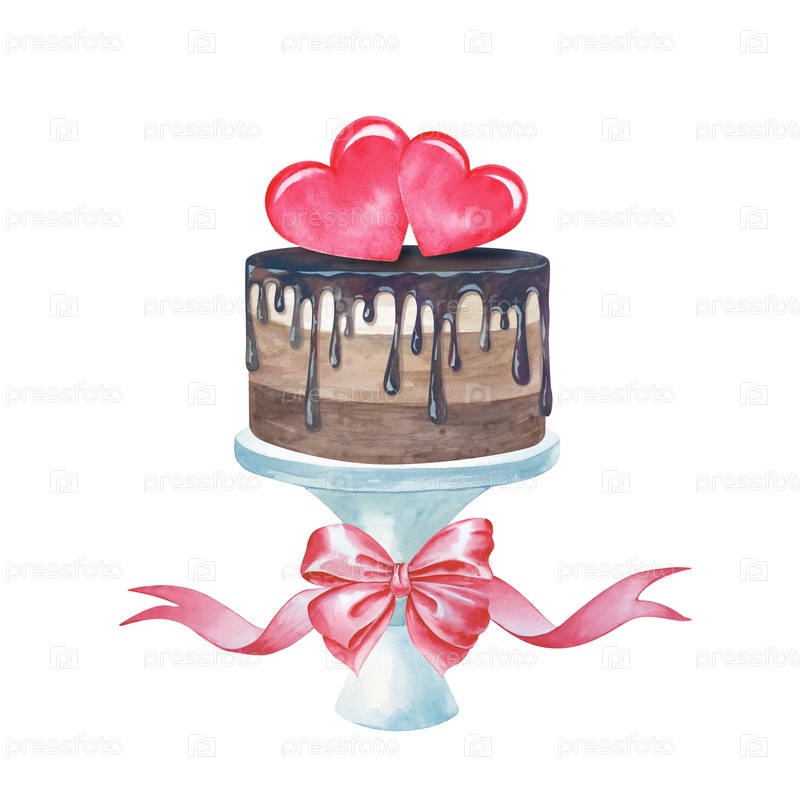 Акварельный свадебный торт с шоколадной глазуркой на стойке. Иллюстрация праздничного десерта с парой сердец и розовой лентой на белом фоне. Шаблон для приглашений, открыток, свадьб и Дня святого Валентина