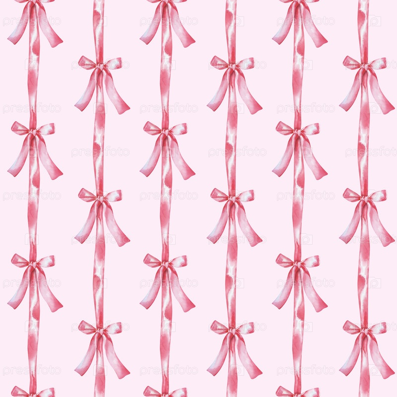 Вертикальный бесшовный рисунок с розовыми лентами и луками на светло-розовом фоне. Иллюстрация акварели. Бесшовный фон для обоев, упаковки, тканей, текстиля, стикеров, открыток, плакатов, скарапбукинга