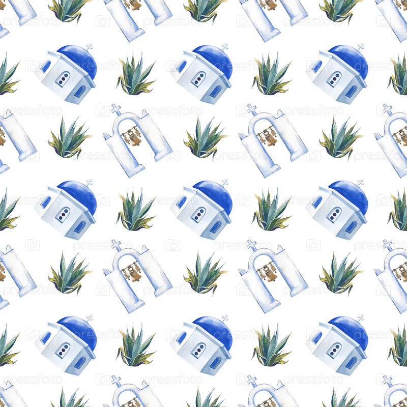 Акварель бесшовный рисунок куполов, греческих колокольни и алоэ вера. Бесшовный фон с национальными достопримечательностями. Шаблон для обоев, текстиля, упаковки подарков и скапбукинга