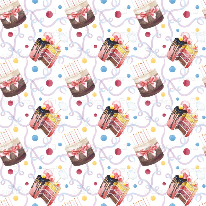 Акварельный бесшовный рисунок с рукописными тортами, свечами, ленточками и конфетти. Праздничная иллюстрация для упаковки, обоев, текстиля, скарапбукинга. Рисунк украшения праздника