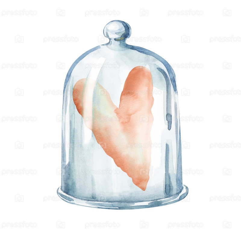Красное сердце под стеклянным чехлом, ручная живопись. иллюстрация акварели выделена на белом фоне. клипарт. колдовство. магия