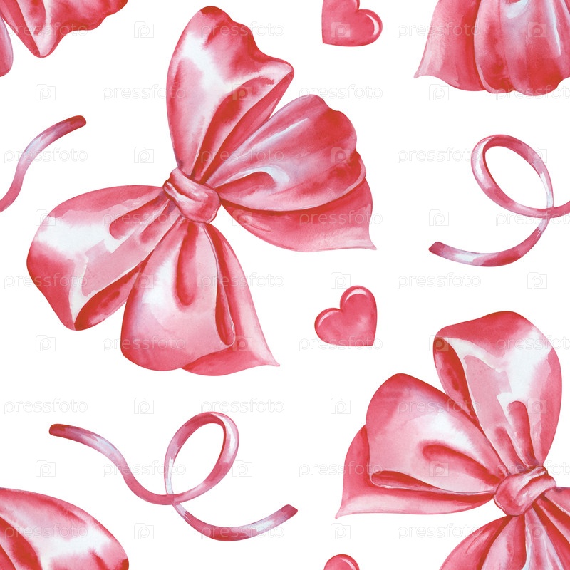 Акварельный бесшовный рисунок с розовыми луками, лентами и сердцами на белом фоне. Бесшовный романтический фон. Монохромный шаблон для ткани, обоев, упаковки, скапбукинга