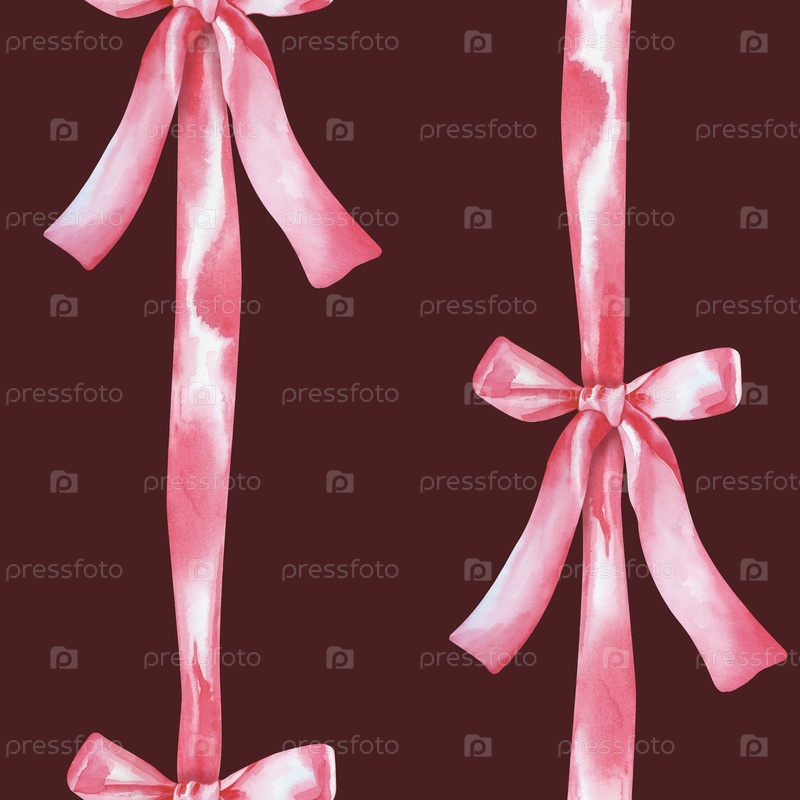 Вертикальный бесшовный рисунок с розовыми лентами и луками на тёмно-бургундском фоне. Иллюстрация акварели. Бесшовный фон для обоев, упаковки, тканей, текстиля, стикеров, карточек, плакатов, логотипов