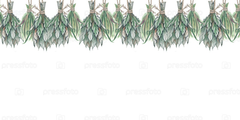 Бесшовная горизонтальная рама с подвешенными сухими пучками и травой на веревке. Илюстрация акварели на белом фоне. Шаблон со свободным местом для вставки. Травы. Witch