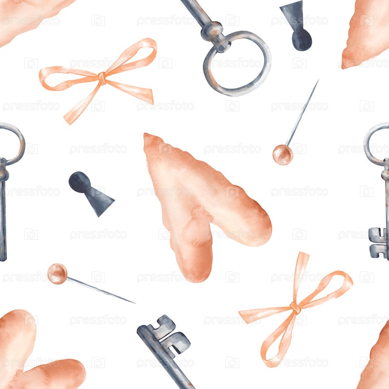 Бесшовный акварельный рисунок с сердцем, ржавым ключом, ключевой дырой, луком и острым штифтом на белом фоне. Элементы нарисованы вручную. Изолированные. Бесшовный фон для скрапбуков, обоев, упаковок и оберточной бумаги