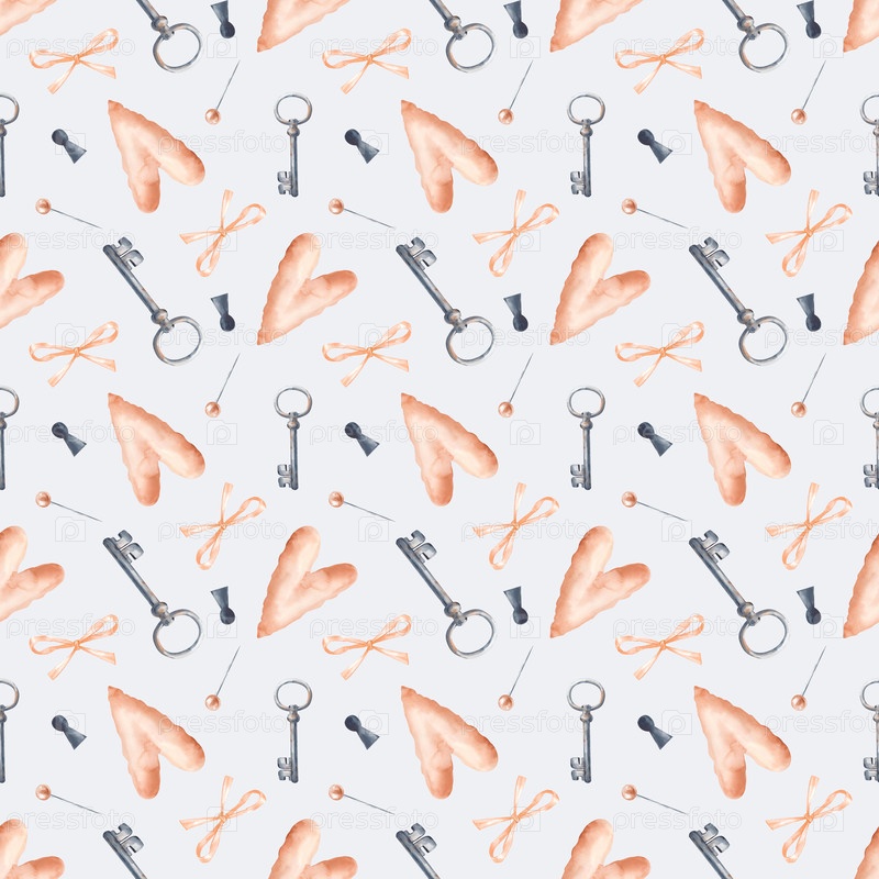 Акварель бесшовный рисунок на светло-сером фоне с элементами, нарисованными вручную. Сердце, ржавый ключ, ключевое отверстие, лук, булавка. Иллюстрация акварели. Бесшовный фон для обоев, скрепбуков, подарочной упаковки