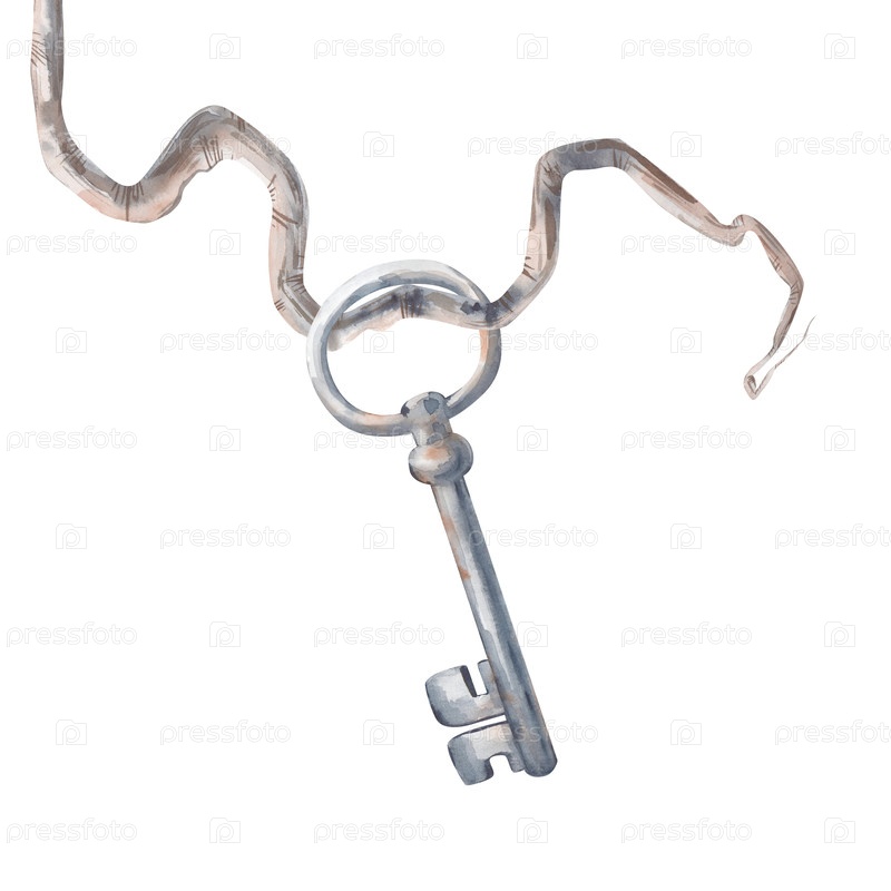 Иллюстрация акварели с железным ключом, висящим на изогнутой ветви дерева. Образец изолирован на белом фоне. Клип-арт. Для дизайна Хэллоуина, сказок, скрапбуков
