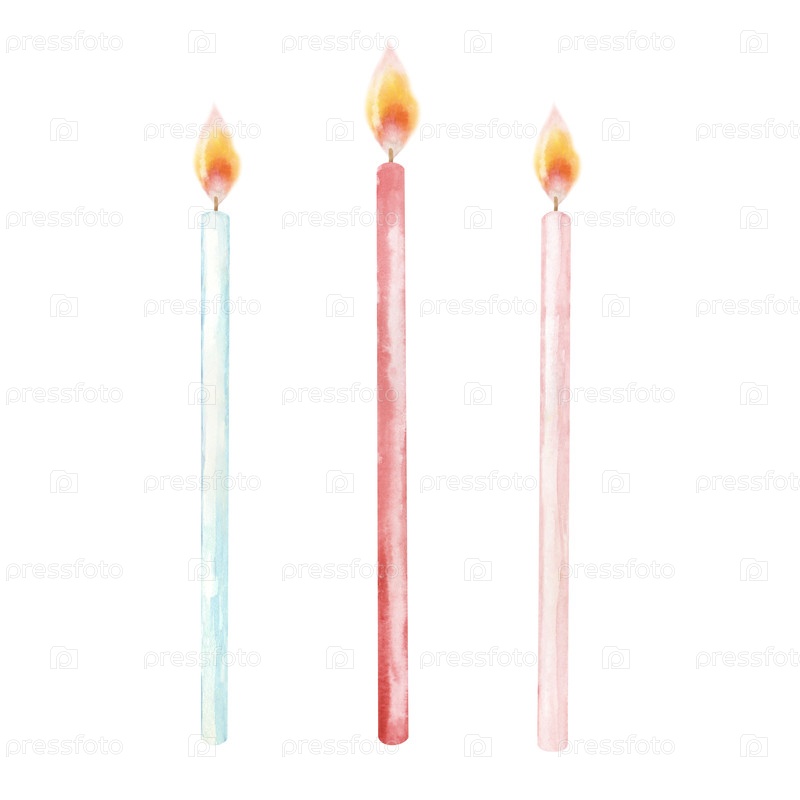 Набор зажженных многоцветных свечей, нарисованных вручную. Иллюстрация акварели выделена на белом фоне. Праздничный декор. Аксессуары для празднования. Клипарт