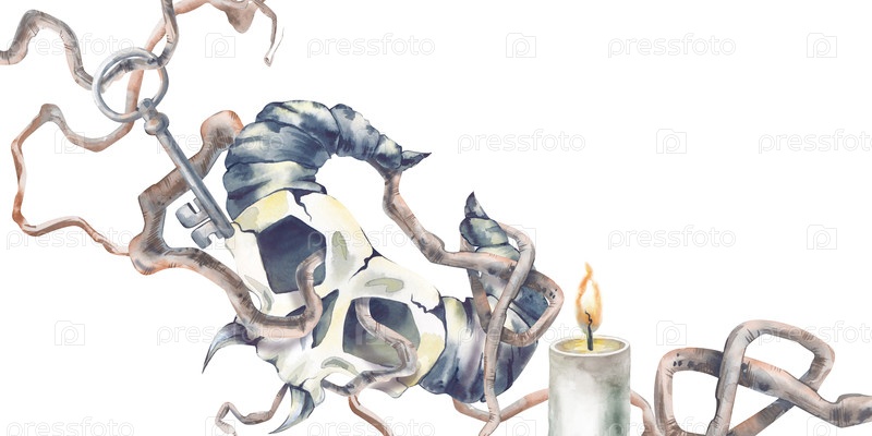 Горизонтальная рама для Хэллоуина или страшных сказок с пустым пространством для вставки. Илюстрация акварели с фантастическим рогатым черепом, переплетенным со изогнутыми корнями деревьев, горящими свечами и ржавым ключом на белом фоне. Мистика