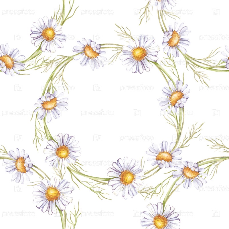 Акварель бесшовный рисунок ромашки. Ботанические иллюстрации с белыми дикими цветами. Изолированная. Бесшовный цветочный фон для упаковочной бумаги, оберток, обоев