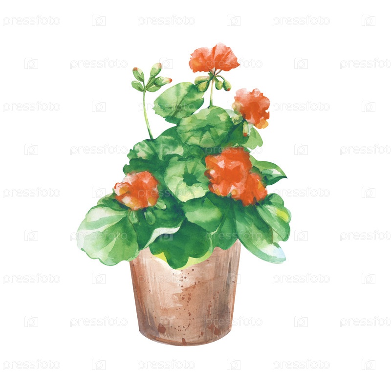 Ручно нарисованный цветочный горшок с гераниями. Иллюстрация акварели выделена белым. Шаблон глиняного горшка с красным цветком. Клипарт. Садоводство. Комнатные растения