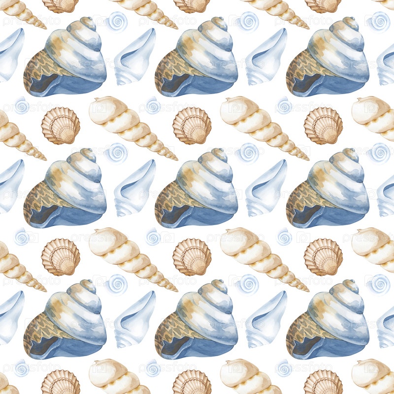 Акварель бесшовный рисунок с раковинами на белом фоне. Иллюстрация акварели. Бесшовный фон. Для дизайна обоев, упаковки, оберточной бумаги, скарапбукинга