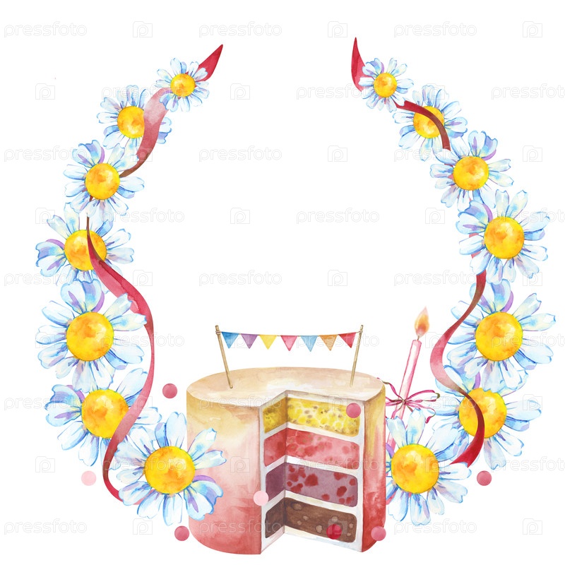 Рамка из ромашки с красной лентой и торт на день рождения с рисованными вручную флагами и свечой Иллюстрация акварели для детского душа Шаблон с пустым пространством для вставки