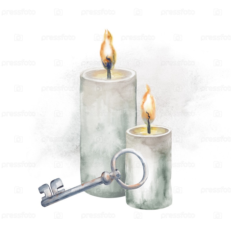 Акварельная композиция с горящими серыми свечами и ржавым ключом на фоне пятна акварели.Элементы рисуются вручную на белом фоне.Изолированы.Мистические иллюстрации для Хэллоуина