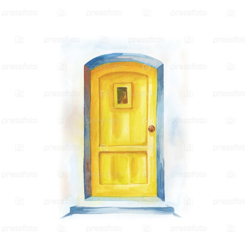 Простая желтая деревянная дверь, написанная вручную на белом фоне. иллюстрация акварели. традиционные архитектурные детали Греции