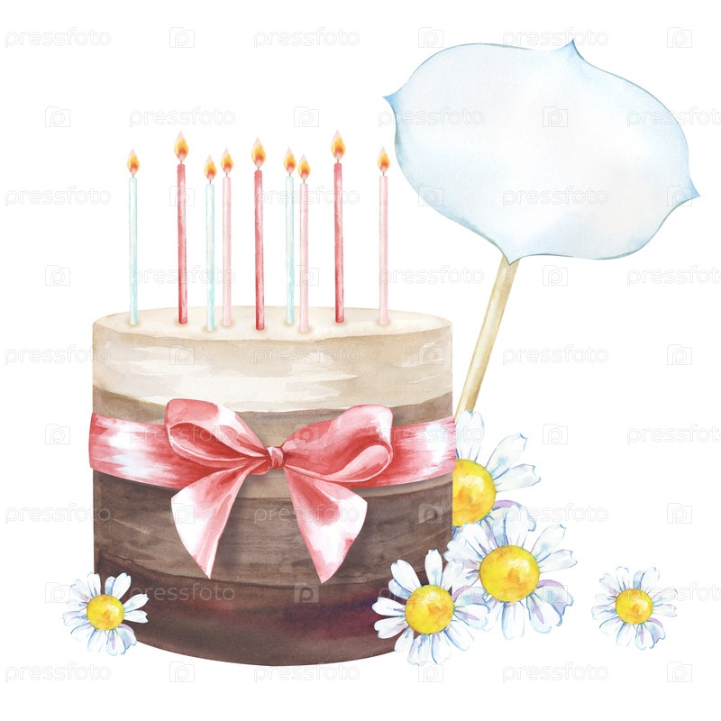Шоколадный торт, связанный розовой лентой с горящими свечами, белыми маргаритками и табличкой для надписи. акварельная иллюстрация праздничного десерта. шаблон открыток, приглашений и приветствий