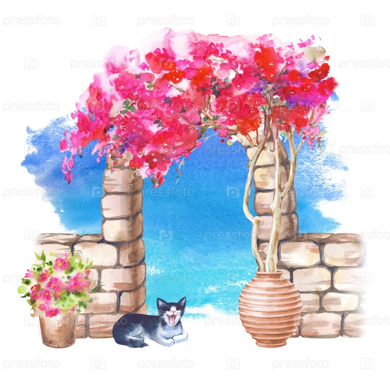 Традиционное греческое изображение кота, мирно лежащего у каменной арки с яркими бугенвиллами и цветочным горшком на фоне голубого неба и моря. Иллюстрация акварели. Шаблон для брошюр, скрапбуков и памятных карт