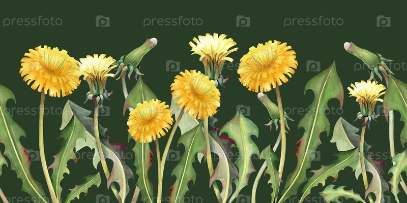 Бесшовная акварель граничит с одуванчиками на зеленом фоне. Акварельная иллюстрация с цветами, листьями и бутонами дикого цветка. Шаблон для летнего дизайна. Садоводство