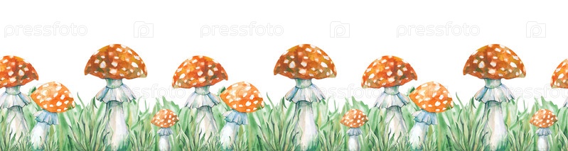 Бесшовная горизонтальная граница с рисованной вручную акварелью мухой агарикой. Ботаническая иллюстрация ядовитых лесных грибов на зеленой траве. Изолированный. Для дизайна сайтов, упаковки, приглашений, открыток и скрапбукинга