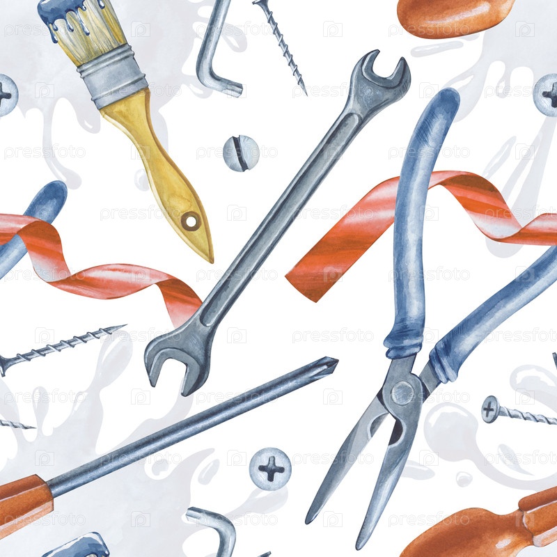 Иллюстрация акварели на белом фоне. Бесшовный шаблон с рабочими инструментами. Модель с мужскими инструментами для ремонта дома. Для дизайна обоев, упаковки