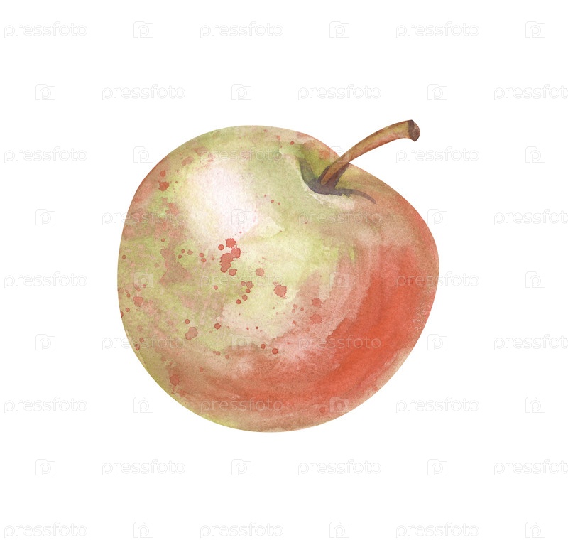Красно-зеленое сочное яблоко с педункулем нарисовано вручную на белом фоне. сладкий плод изолирован. иллюстрация акварели. ботаническая иллюстрация. клипарт