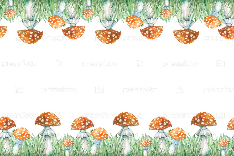 Горизонтальная рамка акварели с рисованными вручную агариками. Ядовитые красные грибы на зеленой траве. Шаблон с пустым местом для вставки. Лесная тема. Ботаническая иллюстрация