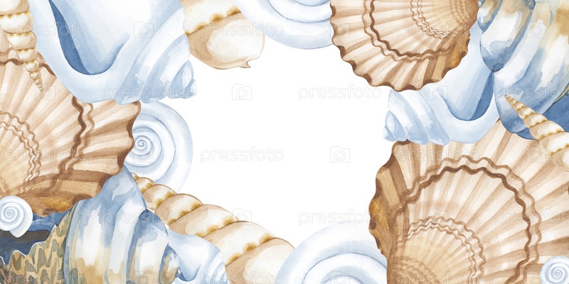 Прямоугольный морской каркас с различными раковинами, написанный вручную акварелью. бежевые, коричневые и белые ракушки. иллюстрация акварели на белом фоне со свободным пространством для вставки