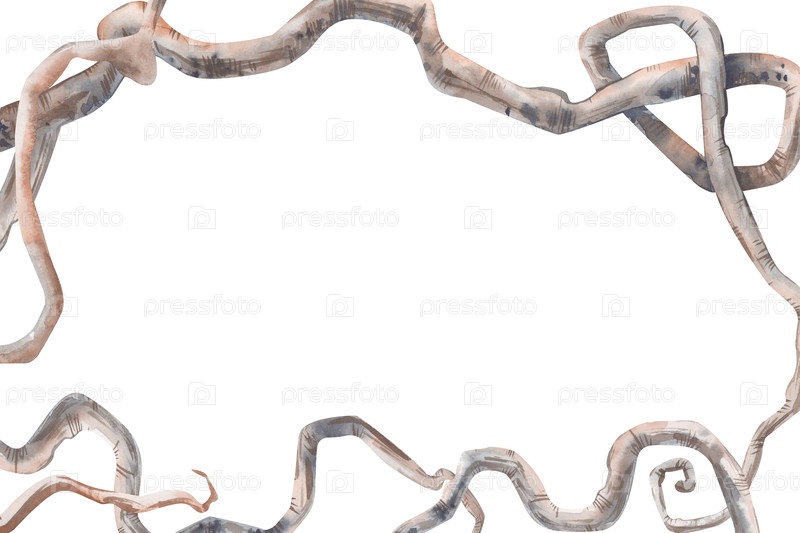 Горизонтальная рама с изогнутыми ветвями деревьев на белом фоне. Илюстрация акварели с пустым пространством для вставки. Баннер со сухими переплетенными корнями. Шаблон для использования в мистических или сказочных темах
