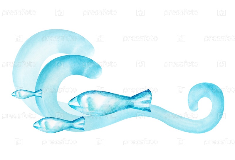 Стилизованная композиция с морской волной и рыбой на белом фоне. акварельные иллюстрации в бирюзовом цвете. изолированный. клипарт для вашего дизайна стиля моря