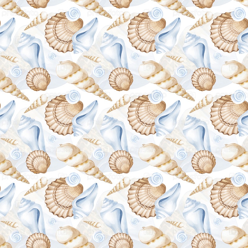 Красивый бесшовный морской рисунок. Акварельный фон с моллюсками. Различные раковины голубых, белых и коричневых цветов. Иллюстрация для украшения праздников в мореходной тематике, обои, упаковка