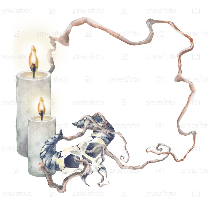 Квадратная рама сухих переплетенных ветвей деревьев, горящие свечи и фантастический череп с рогами.Илюстрация акварель изолирована.Для украшения сказок ужасов или Хэллоуина