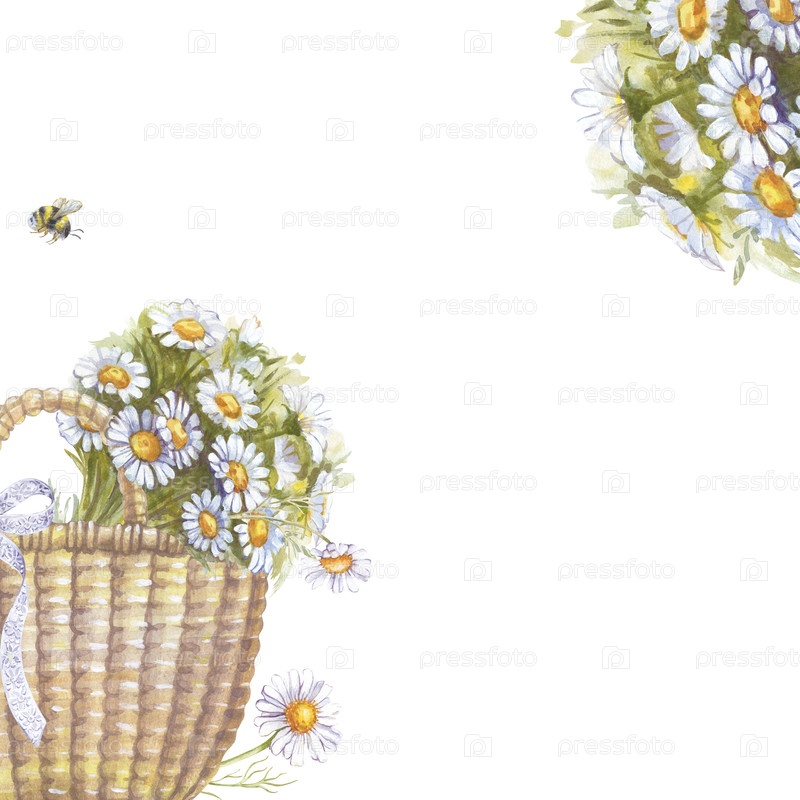 Квадратная летняя рама с корзиной, букетом ромашки и маленьким шмелем, нарисованными вручную. Шаблон акварели для вашего дизайна. Пустое пространство для вставки. Садоводство. Фермерия. Пикник. Отдых на свежем воздухе